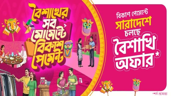 প্রতিবারের মতো এবারও ১লা বৈশাখ উদযাপনের কেনাকাটাকে আনন্দময় ও সাশ্রয়ী করতে আকর্ষণীয় সব ডিসকাউন্ট ও ক্যাশব্যাক অফার নিয়ে এসেছে বিকাশ। প্রিয়জনদের কিংবা নিজের জন্য কেনাকাটায় পছন্দের লাইফস্টাইল, ফুড, টিকেট ও ট্রাভেল, গ্যাজেটস, অনলাইন শপিংসহ দেশজুড়ে ১৫ হাজারের বেশি আউটলেটে বিকাশ পেমেন্টে থাকছে ১,৩৫০ টাকা পর্যন্ত ডিসকাউন্ট ও ক্যাশব্যাক।